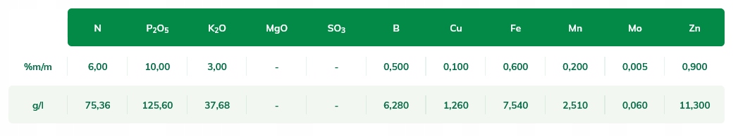 do stosowania w kukurydzy. Skutecznie dostarcza całą paletę składników pokarmowych (makro i mikroelementów) – skutecznie odżywia fosforem w warunkach ograniczonego pobierania tego składnika z gleby (niskie temperatury, nieodpowiednie pH, deficyty opadów).