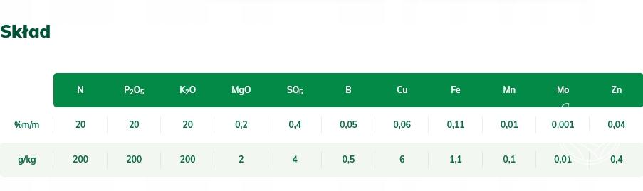 Skład: N, P2O5, K2O, MgO, SO5, B, Cu, Fe, Mn, Mo, Zn