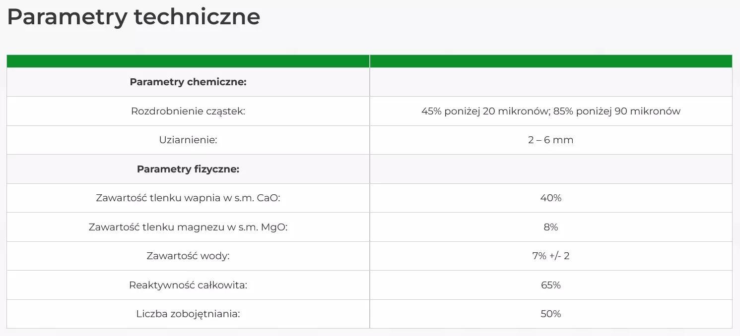 Głowna substancja: składa się z granulowanej mączki wapiennej i mączki dolomitowej – wapń całkowity 40 % CaO i 8 % MgO