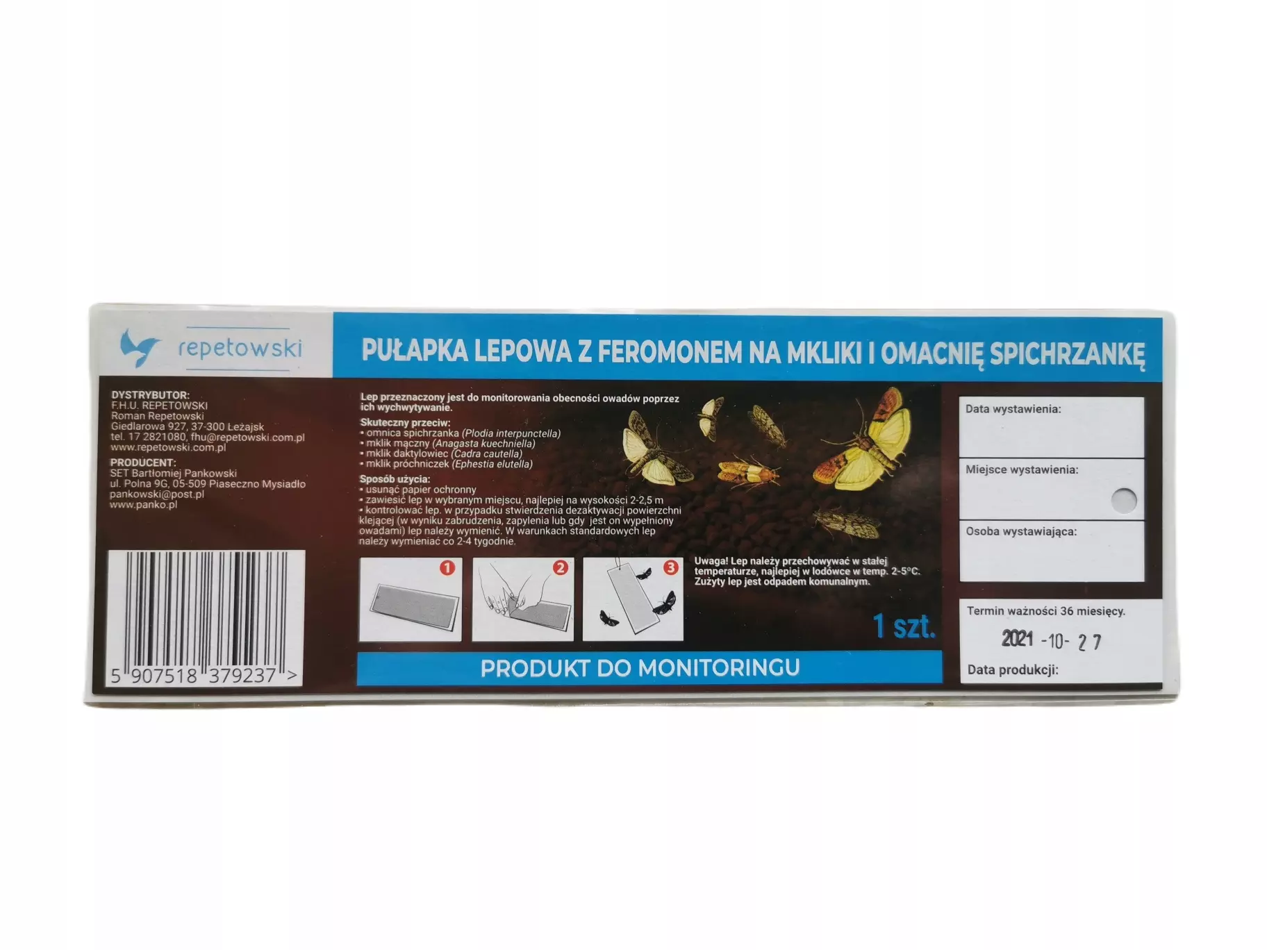 - Lep posiada praktyczny otówór do zawieszenia, feromon dodany bezpośrednio do kleju, miejsce na wpis serwisowy, opakowany w folii gazoszczelnej