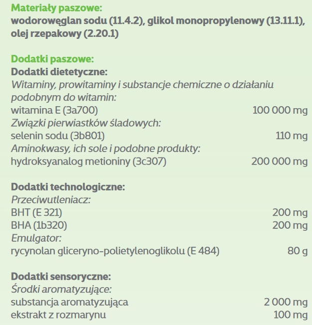 kompozycja witaminy E, selenu oraz metioniny. Preparat opracowany z myślą o zapobieganiu dystrofii mięśniowej u młodych zwierząt oraz o wzmocnieniu statusu immunologicznego i odporności na stres oksydacyjny. Jest również niezbędny w profilaktyce zaburzeń płodności. Produkt przeznaczony jest także do uzupełniania zawartości limitującego aminokwasu egzogennego metioniny
