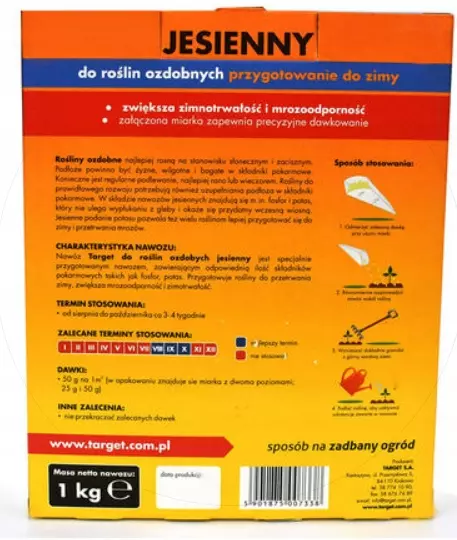 Nawóz Target do roślin ozdobnych jesienny jest specjalnie przygotowanym nawozem dla tej grupy roślin, zawierającym odpowiednią ilość potasu oraz fosforu.