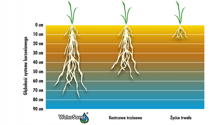Dzięki głębokiemu systemowi korzeniowemu odmiany zastosowane w mieszance Water Saver pozyskują wodę z głębszych warstw gleby. Korzenie większości traw nie sięgają tak głęboko i rośliny mogą pobierać wodę tylko z powierzchniowej warstwy gleby (o miąższości 10 do 15 cm). Podczas suszy takie rośliny szybko obumierają, nawet jeszcze przed osiągnięciem stadium ekstremalnego przesuszenia. Korzenie kostrzewy trzcinowej zawartej w mieszance Water Saver mogą sięgać na głębokość ponad 60 cm; dodatkowo roślina może przechowywać w nich wodę i substancje odżywcze (cukry), tworząc zapasy na okres suszy. Wiechlina łąkowa zapewnia poziomy rozrost roślin, skutkujący powstaniem rozbudowanej sieci kłączy i korzeni.
